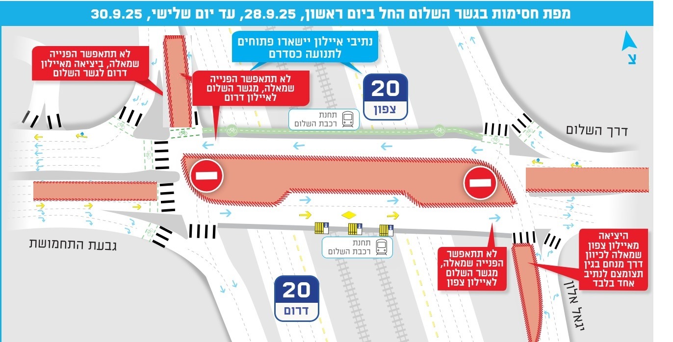 הפנייה שמאלה מאיילון דרום לגשר השלום תיחסם.