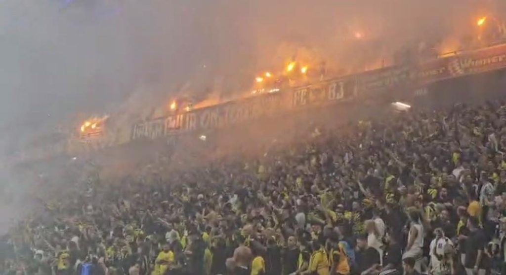 עם שריקת הפתיחה הודלקו באחת היציעים מספר אבוקות שלא נזרקו לכר הדשא אך לדברי המשטרה היוו סכנה ממשית לחיי אדם. בעקבות חקירת מצלמות האבטחה, אותרו האוהדים החשודים ונעצרו.
