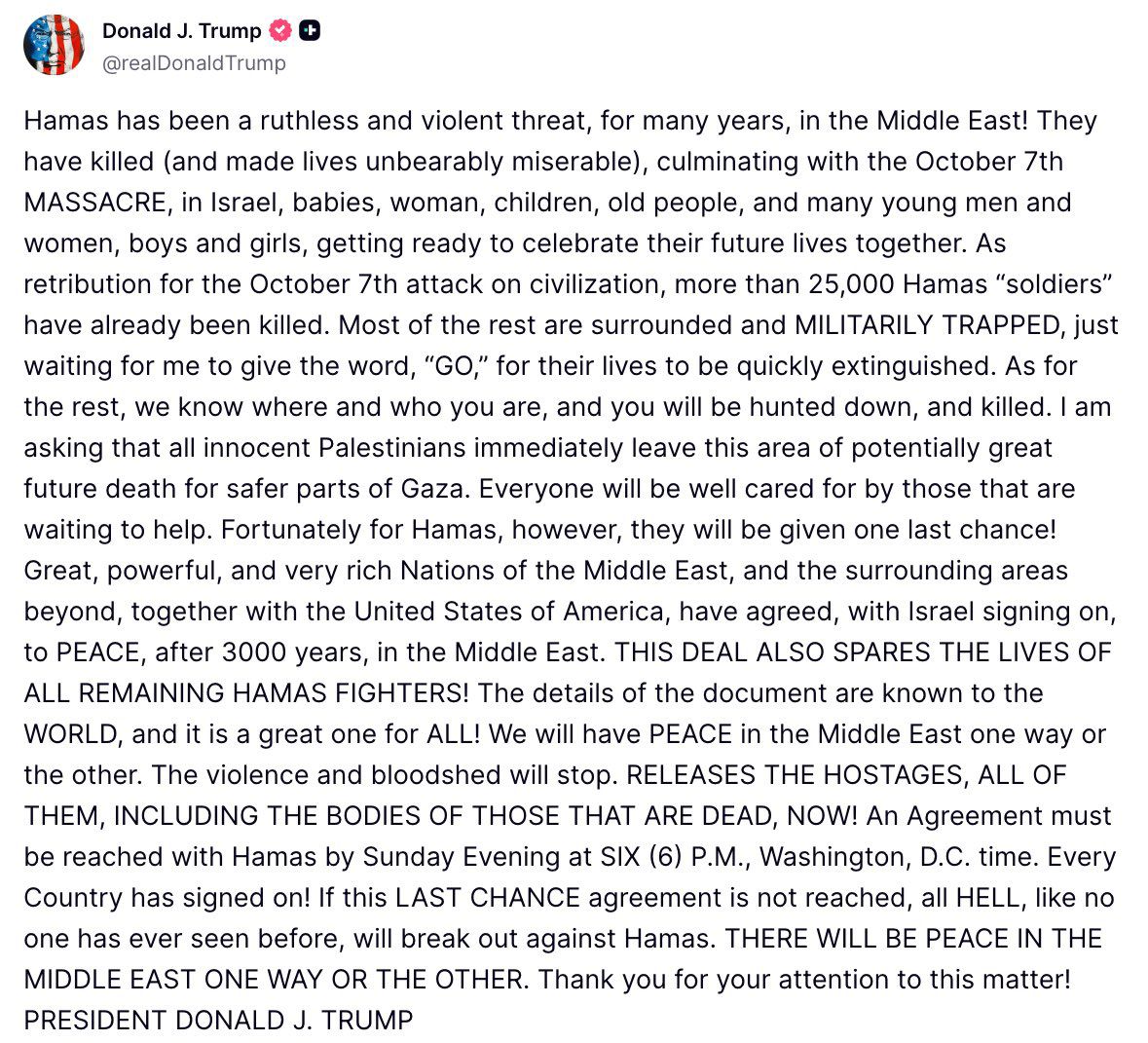 נשיא ארצות הברית צייץ היום אולטימטום ברור לארגון הטרור חמאס שממשיך להתנגד לעסקה שהציע הנשיא טראמפ ולו הסכים רה"מ בנימין נתניהו.