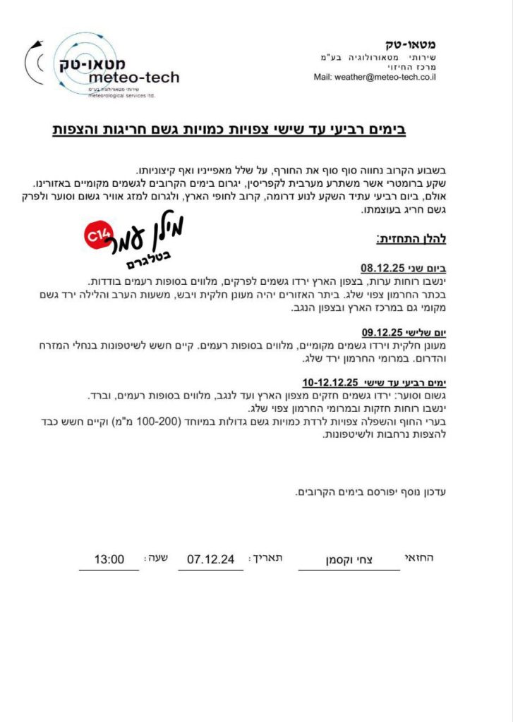 ב"מטאו-טק" מציינים כי ישנן עדויות לקראת כמויות גשם גדולות במיוחד בין 100 ל-200 מ"מ באזורים מסוימים בזמן קצר.