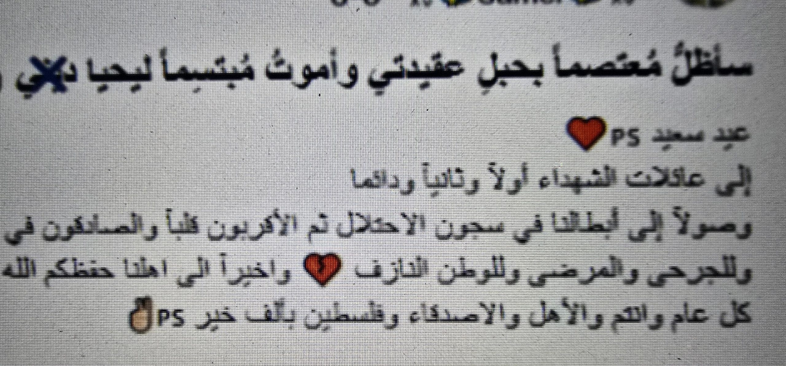 בין היתר כתב: ״אשאר מבוצר וקשור בחבל לאמונתי ואמות בחיוך כדי שדתי תחיה… חג שמח למשפחות הקדושים, לגיבורים שלנו בבתי הכלא של הכיבוש…״ – דברים ששולבו עם קטע מנאומו של איסמעיל הניה. החשוד נעצר על ידי שוטרי מרחב דוד, ולאחר חקירה וראיות שנאספו נגדו, הוגשה הצהרת תובע ומעצרו הוארך עד מחר.