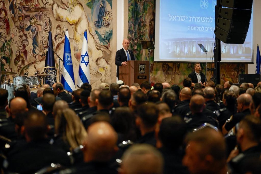 יו"ר הכנסת פנה לשוטרים בדברים נרגשים: "במשמרת ושלא במשמרת, מהתחנות ומהבתים, עם או בלי מדים, עם או בלי נשק עזבתם את המשפחות ויצאתם כשמעליכם מטחי טילים וצרורות ירי. זה הרגע שבו הרגשתם שהדגל קורא לכם. כי בני ישראל היו בצרה, ואתם באתם להושיע."