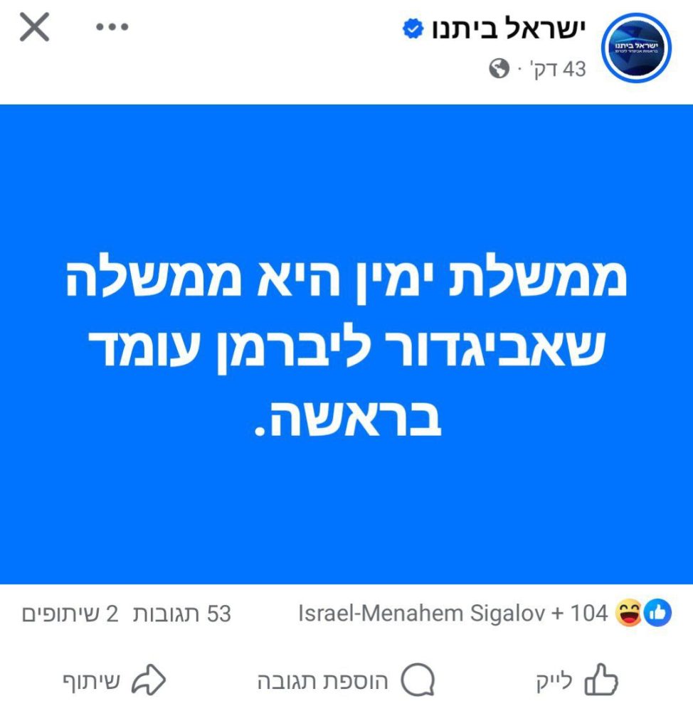 בפוסט נכתב: "ממשלת ימין היא ממשלה שאביגדור ליברמן עומד בראשה" והתגובות לא איחרו לבוא.