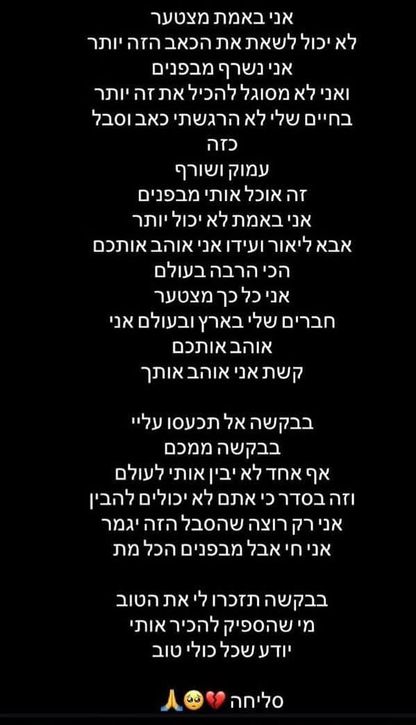 שורד טבח הנובה רועי שלו, שם קץ לחייו אמש במושב אודים שבשרון זמן קצר לפני כן העלה פוסט כואב וקשה לקריאה ושיתף בתחושותיו.