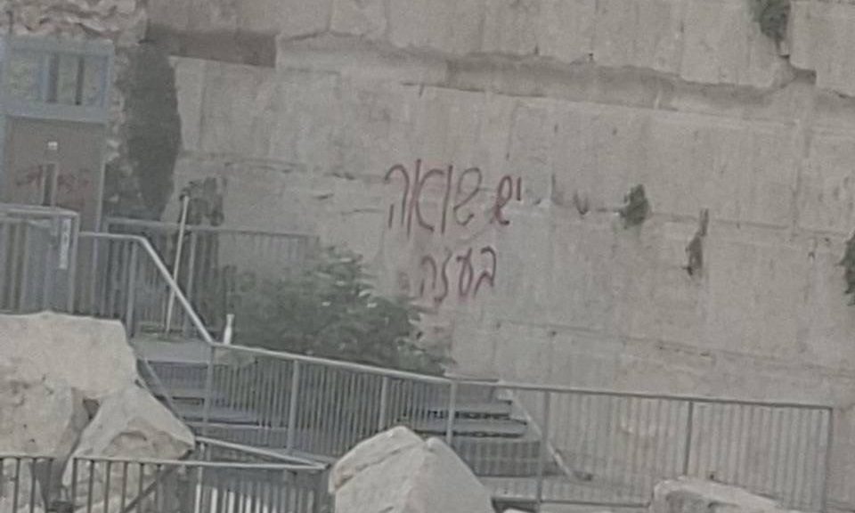 בתמונה: הגרפטי על קיר בית הכנסת הגדול בירושלים