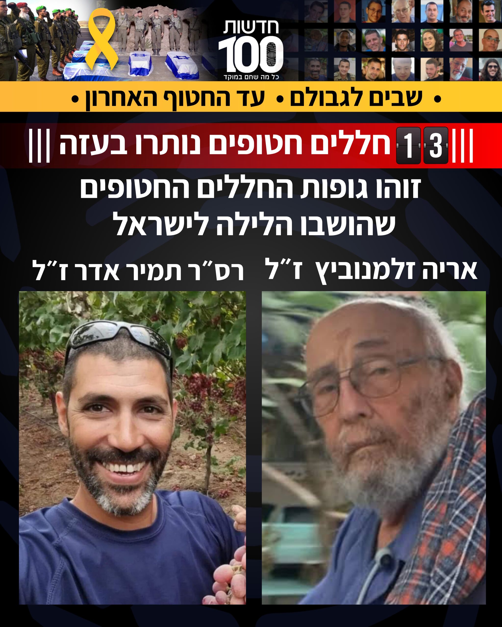 לאחר שנתיים של ציפייה וכאב, השלימו צוותי המרכז הלאומי לרפואה משפטית, בשיתוף משטרת ישראל והרבנות הצבאית, את הליך הזיהוי של שניים מהחטופים שנרצחו ונשבו בעזה, רס"ר תמיר אדר ז"ל ואריה זלמנוביץ ז"ל, שניהם מקיבוץ ניר עוז.